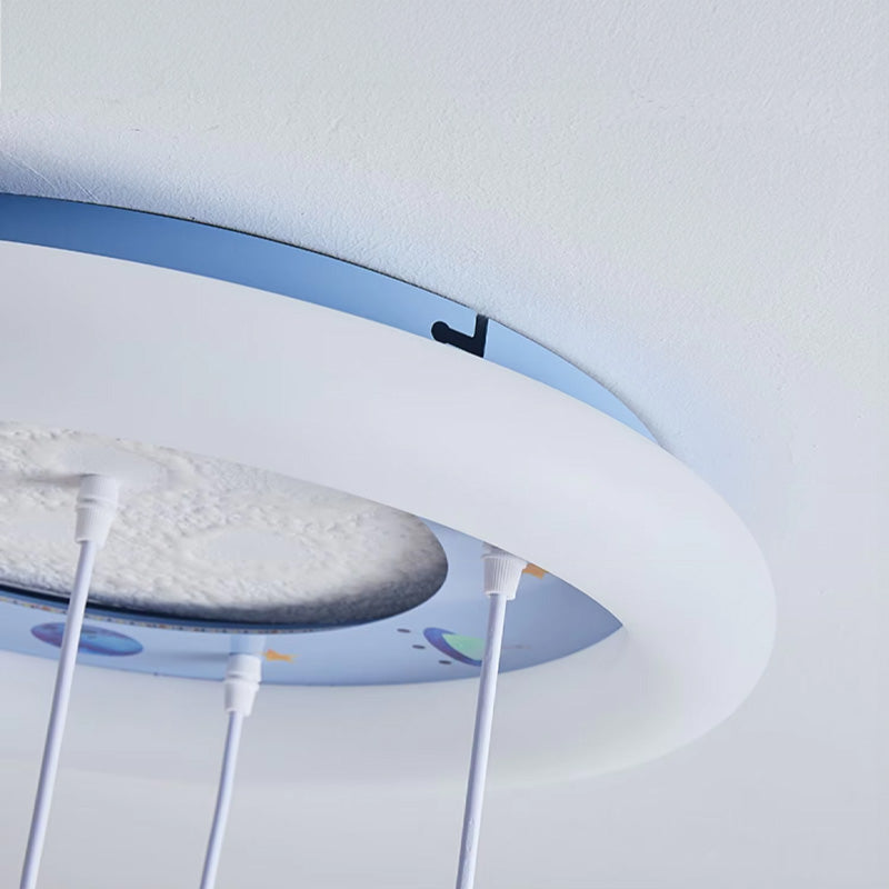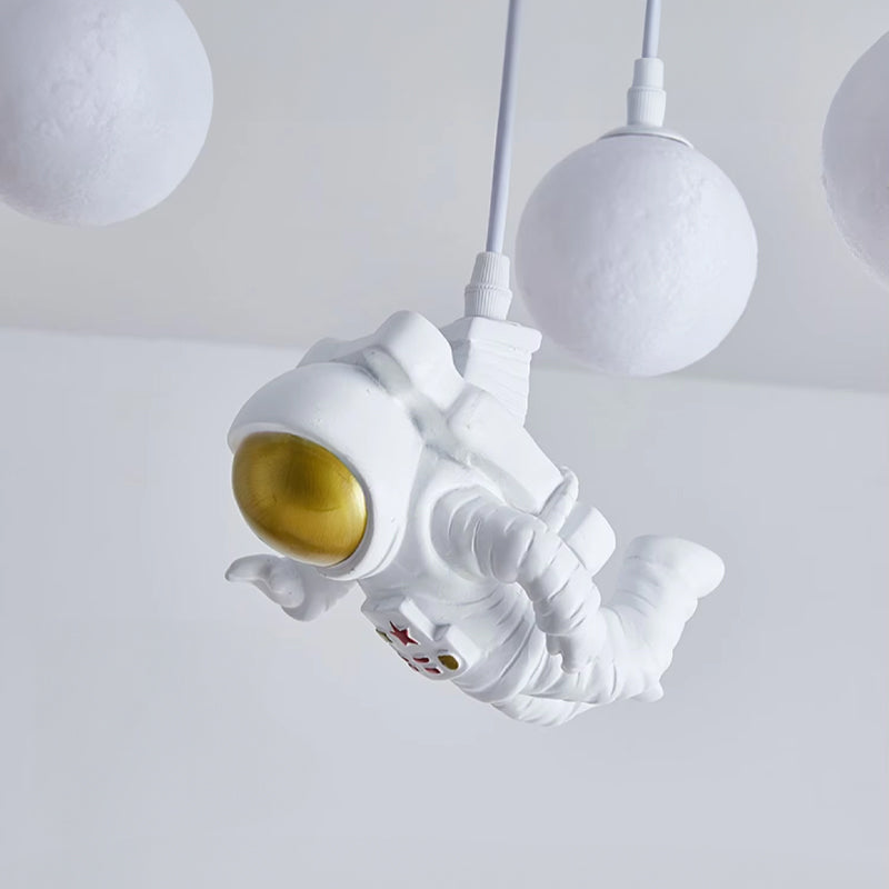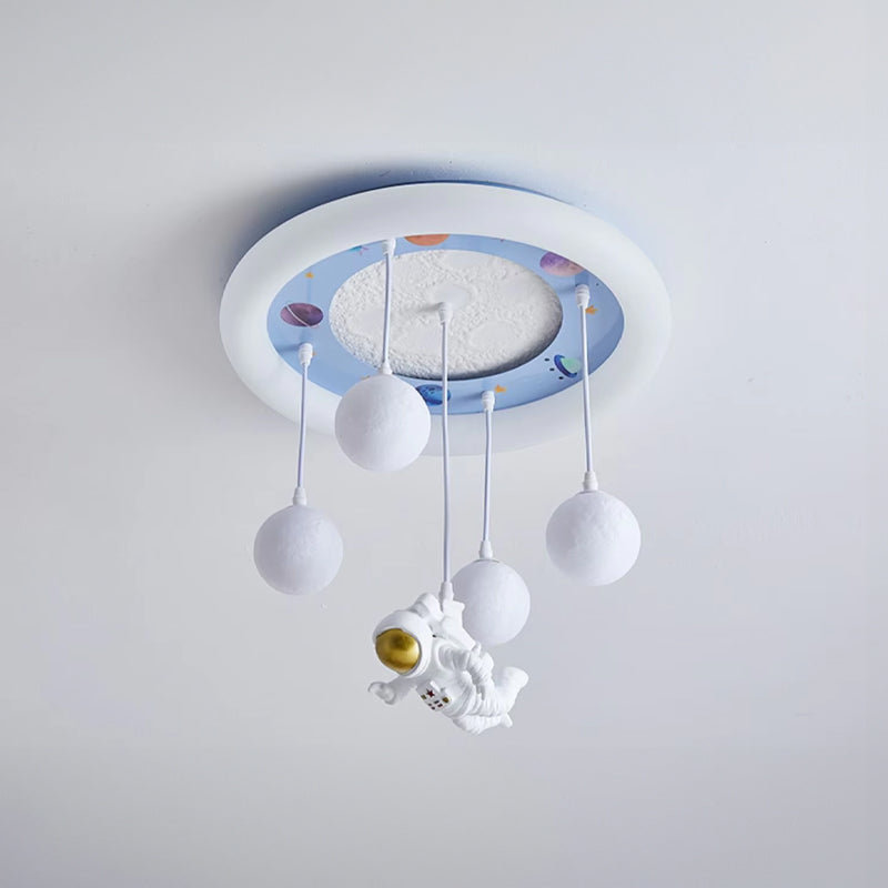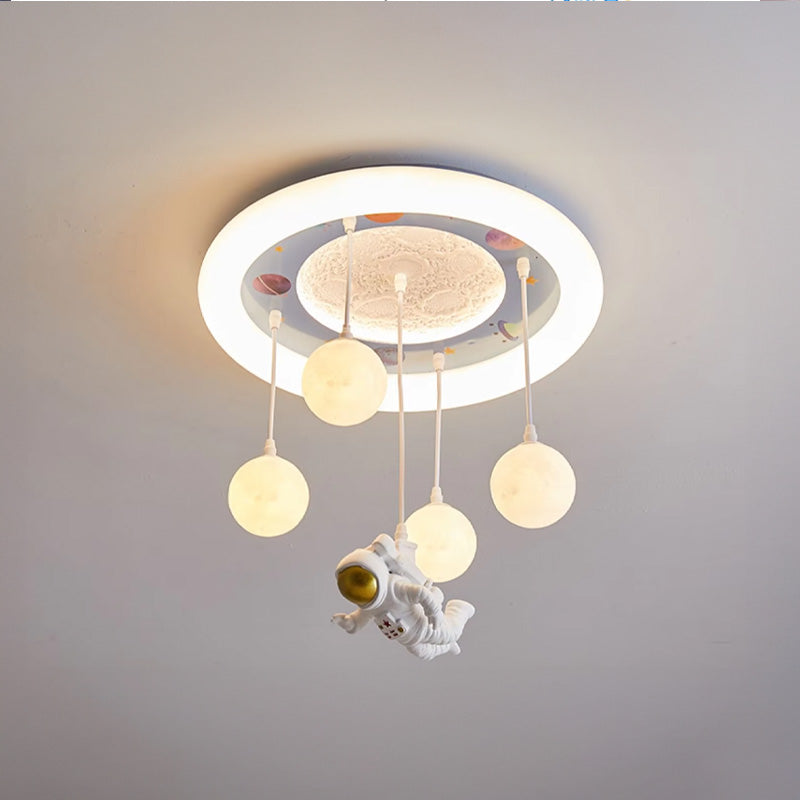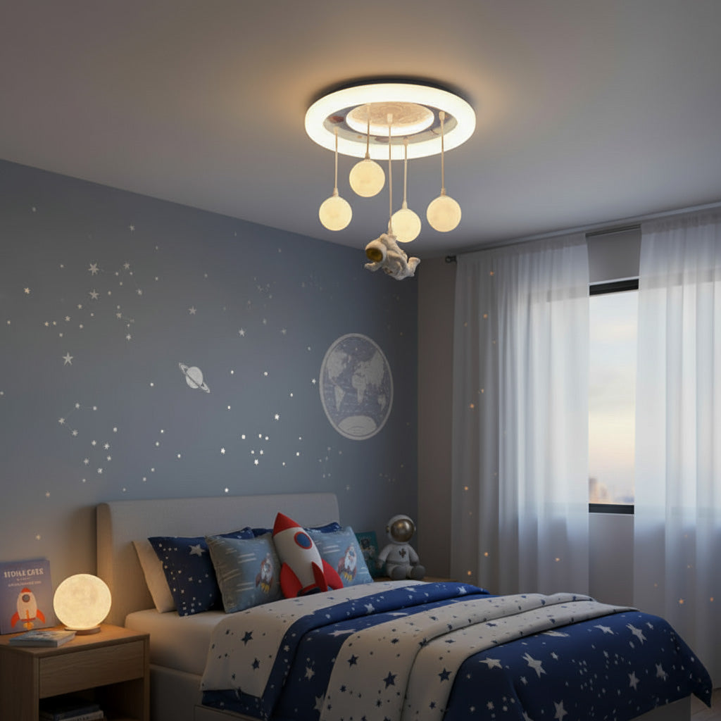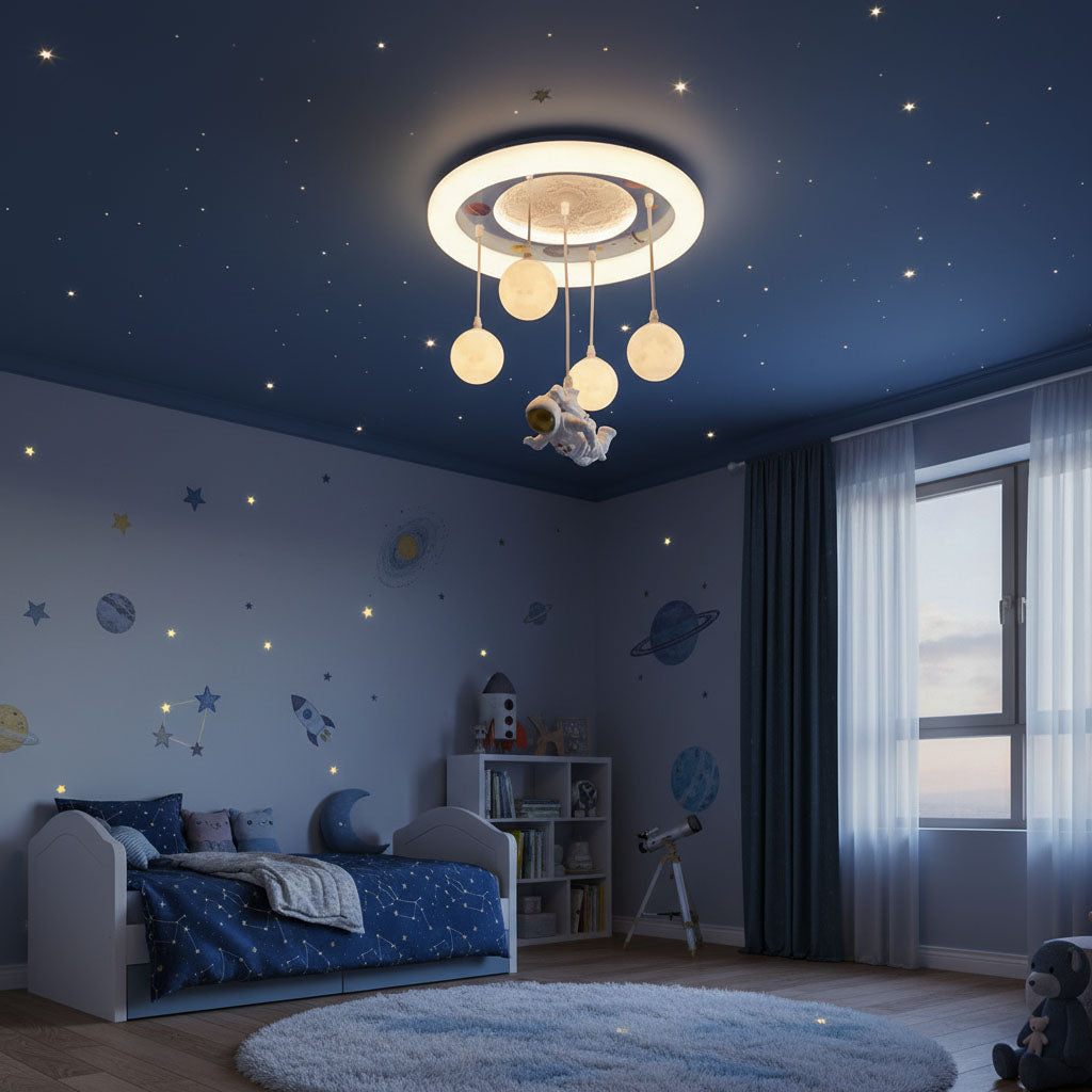 Illuminate your child's imagination with the CRATER CRAFTER children's ceiling lamp. This unique fixture features a roaming astronaut crafting the moons, providing a playful touch to any bedroom. With multiple light sources, including a ring light and dangling moonlights, bedtime will become an out-of-this-world experience. Blast off into dreamland with the CRATER CRAFTER!