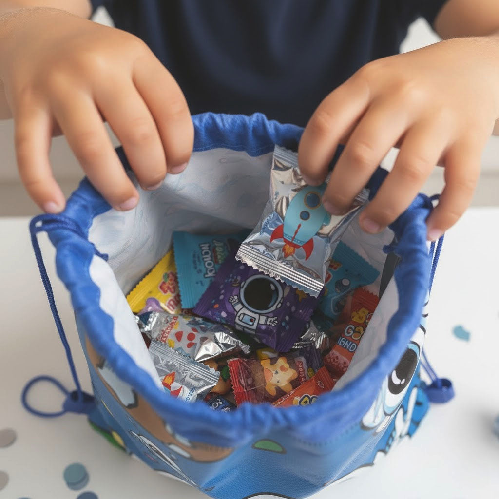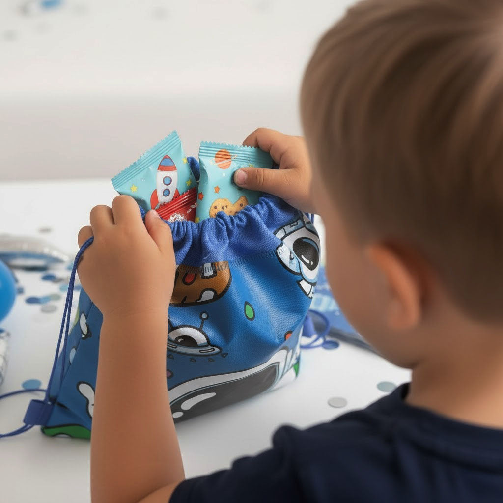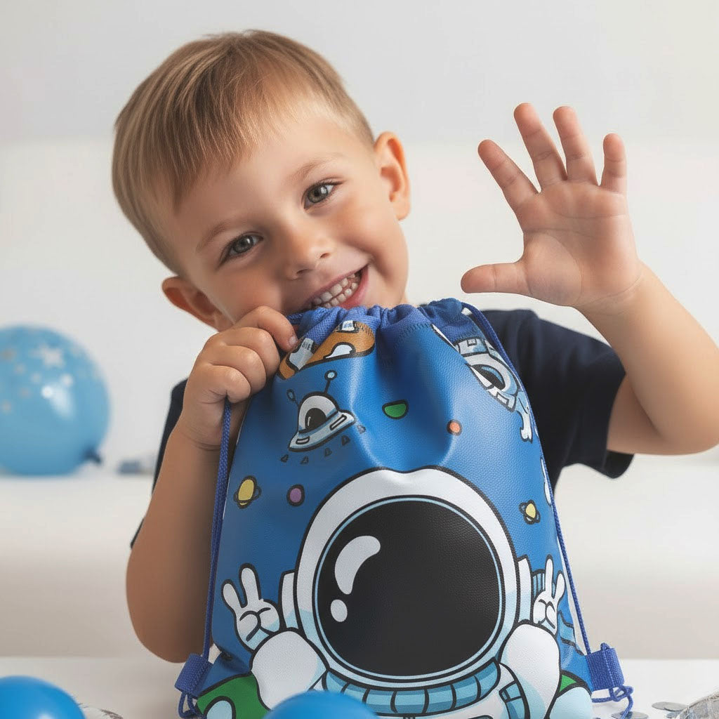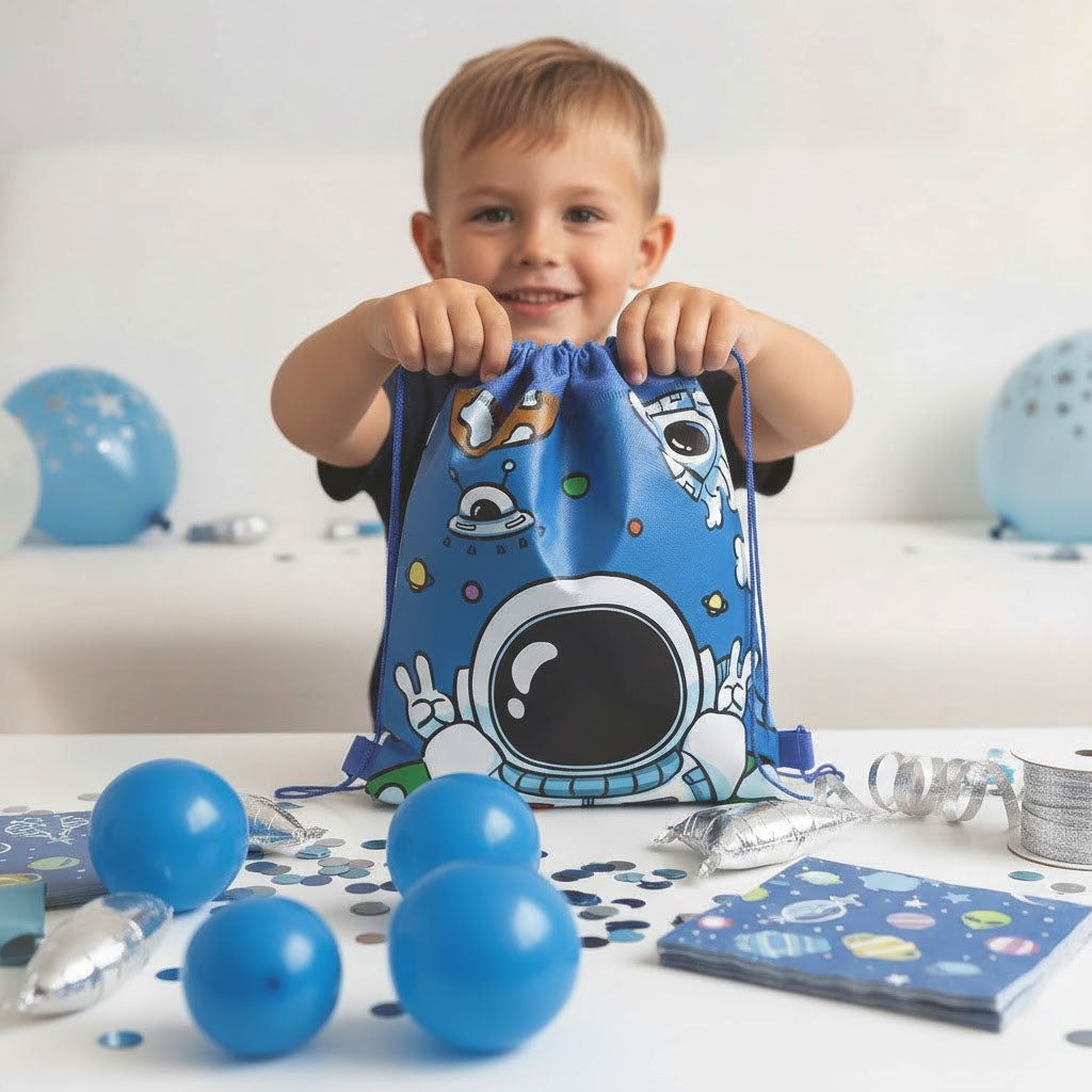 No fuss, no mess! The convenient drawstring design makes it simple for kids to carry their party treasures home, plus these bags are environmentally friendly and reusable for future space missions!