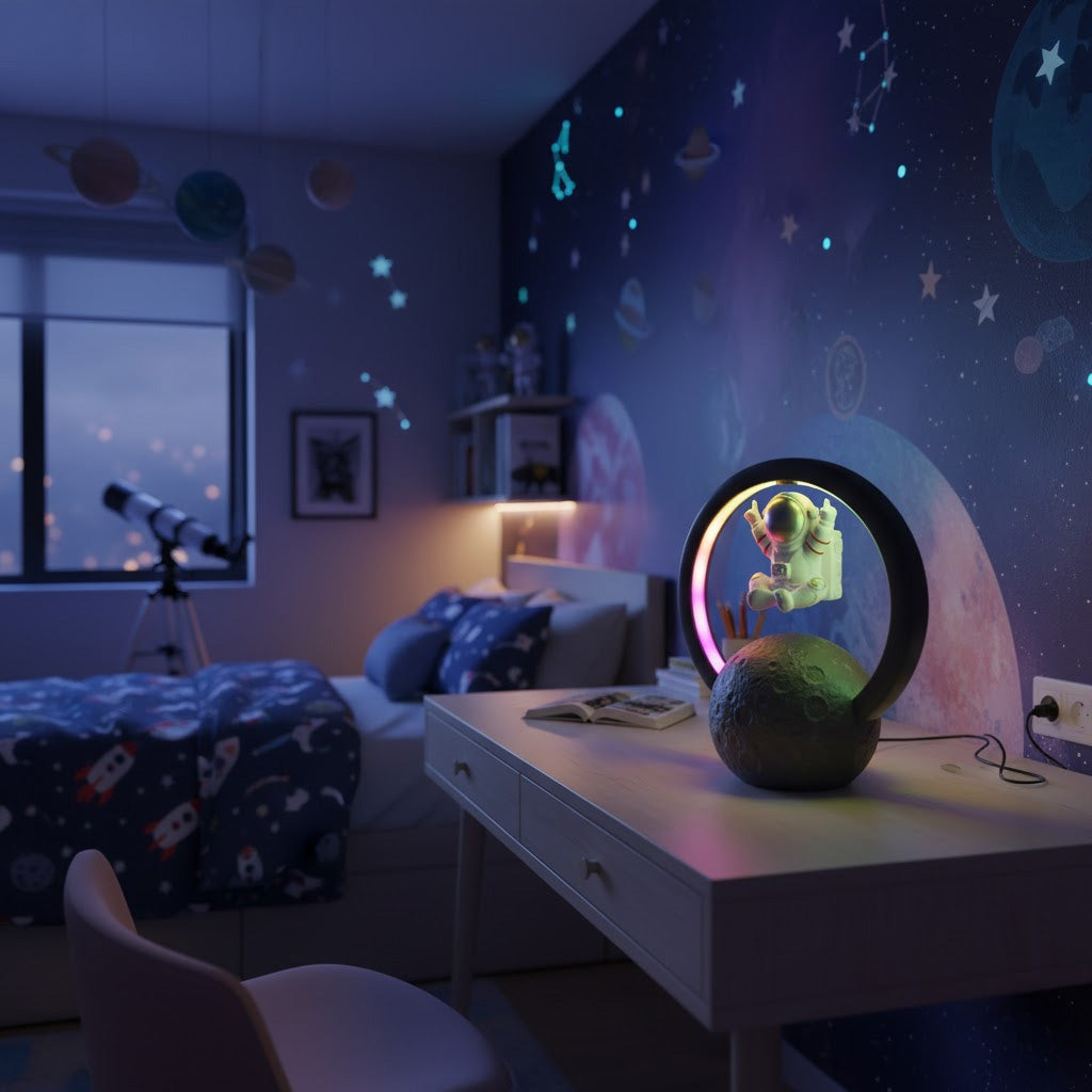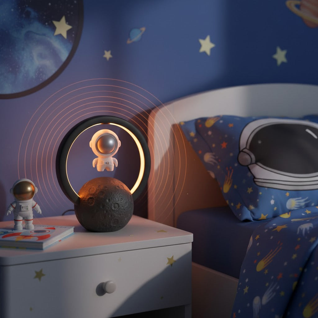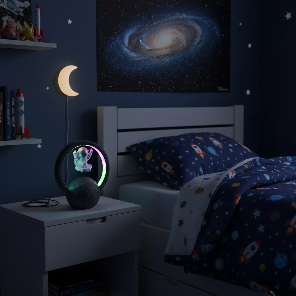 Get ready to blast off into a musical galaxy with ROCK'N ROAM™ Bluetooth speaker lamp. Watch in awe as an astronaut levitates on the moon while the speakers emit a rainbow of ambient light. Get ready to rock and roll (or 'rock' and roam!) with this unique and playful addition that will take your tunes to a whole new level. No gravity required!