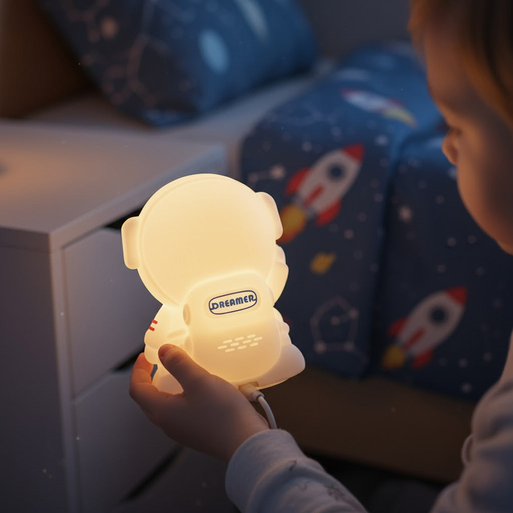 Greet the SWEET DREAMER™ into your orbit! This adorable astronaut-shaped ambient lamp is here to blast your bedroom into a starry realm of cosy vibes. Crafted with silicone, this cute lamp is perfect for a gentle nightlight to help you get your beauty sleep. Control the illuminated journey with timer settings, adjustable RGB tones and brightness that you can customize with just a tap. Recharge with ease through its USB-C connection - now that's out of this world!
